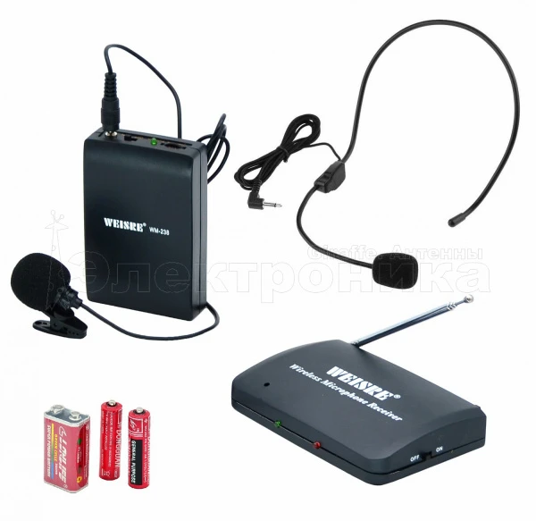 Параметры: Рабочий диапазон: 50м Частотная характеристика аудио: 100-10 кГц Режим конвертирования: FM Коэффициент сигнал / шум:> 60 дБ; Чувствительность: 54 дБ / uV Выходы: 3.5мм Внешний источник питания 6V/1A или 2*AA (в комплекте) Питание приёмника 9V (в комплекте) В комплекте: радиомикрофон — 2 шт., база, 3 элемента питания кабель 6.3-6.3мм