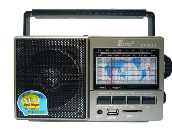FM: 76-108 MHz AM: 530-1600 KHz SW: 3.2-22 MHz Разъёмы: USB, SD(до 32Гб),3.5mm для наушников Питание: 220V шнур в комплекте / 4*R20 (в комплект не входят) Размер: 21 х 12 х 7 см