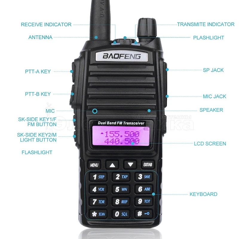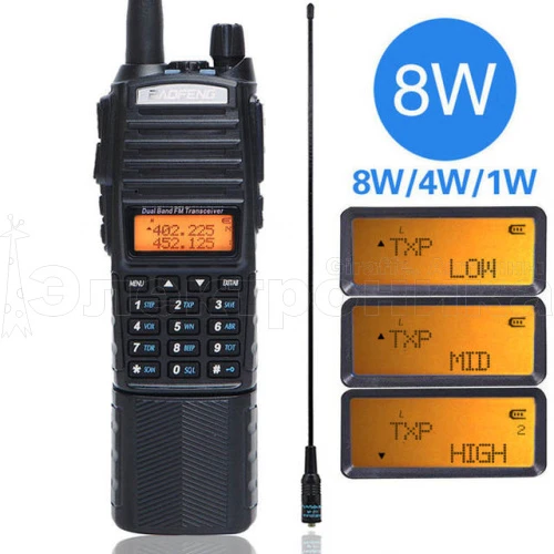 Двухдиапазонная рация Baofeng UV-82(MK5) 8 Ватт — это оптимальный вариант для тех, кто хочет купить мощное средство связи по демократичной цене. Усиленный 8 ваттный трансивер дополняет аккумулятор повышенной емкости 2800 мАч, существенно расширяющий время работы рации без подзарядки. Усиленная мощность повышает радиус передачи сигнала. Эта модель способна обеспечить связь на расстоянии 10 — 15 км в условиях прямой видимости. Владельцы также положительно отзываются об опции настройки 128 каналов, поддержке 50 CTCSS субтонов, 105 DCS субтонов, сканировании субтонов. Портативная рация снабжена фонариком, FM-приёмником, опцией активации голосом (VOX) и сигналом тревоги. В Mirkit можно заказать эту модель с доставкой по Москве и России. ТЕХНИЧЕСКИЕ ХАРАКТЕРИСТИКИ: Диапазон частот: 400-470 / 136-174 Мгц Мощность: до 5Вт Емкость аккумулятора: 2800 мАч - BL-8 Пылевлагозащита: IP54 Число каналов: 128 Шаг сетки частот: 5 кГц Напряжение питания: 7.4 В Чуствительность: 0.16 мкВ