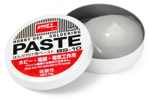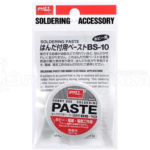 Паяльная паста BS-10. Высокая активность позволяет паять даже окисленные поверхности из черных и цветных металлов. Не применяется для пайки печатных плат. Применяется для пайки бытовой аппаратуры, проводов и тд. Остатки легко смываются бензином или спиртом. Состав: - Вазелин (основа) 80-90% - Парафин 6-9% - Цинк хлорид 4-6% - Аммоний хлорид 1-3% - Вода 2-4% Вес: 10 г. Упаковка: Жестяная баночка