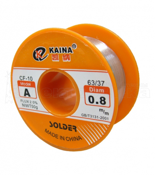 Припой-катушка в проволоке c флюсом Применяется в радиопромышленности для лужения и пайки паяльником электро и радио аппаратуры. Состав: Sn (олово) — 63%, Pb (свинец) — 37%, Флюс 2%, Cl (хлор в качестве флюса) — менее 0, 1%. Диаметр припоя составляет 0.8 мм, вес: 50 г., температура плавления: 183 C